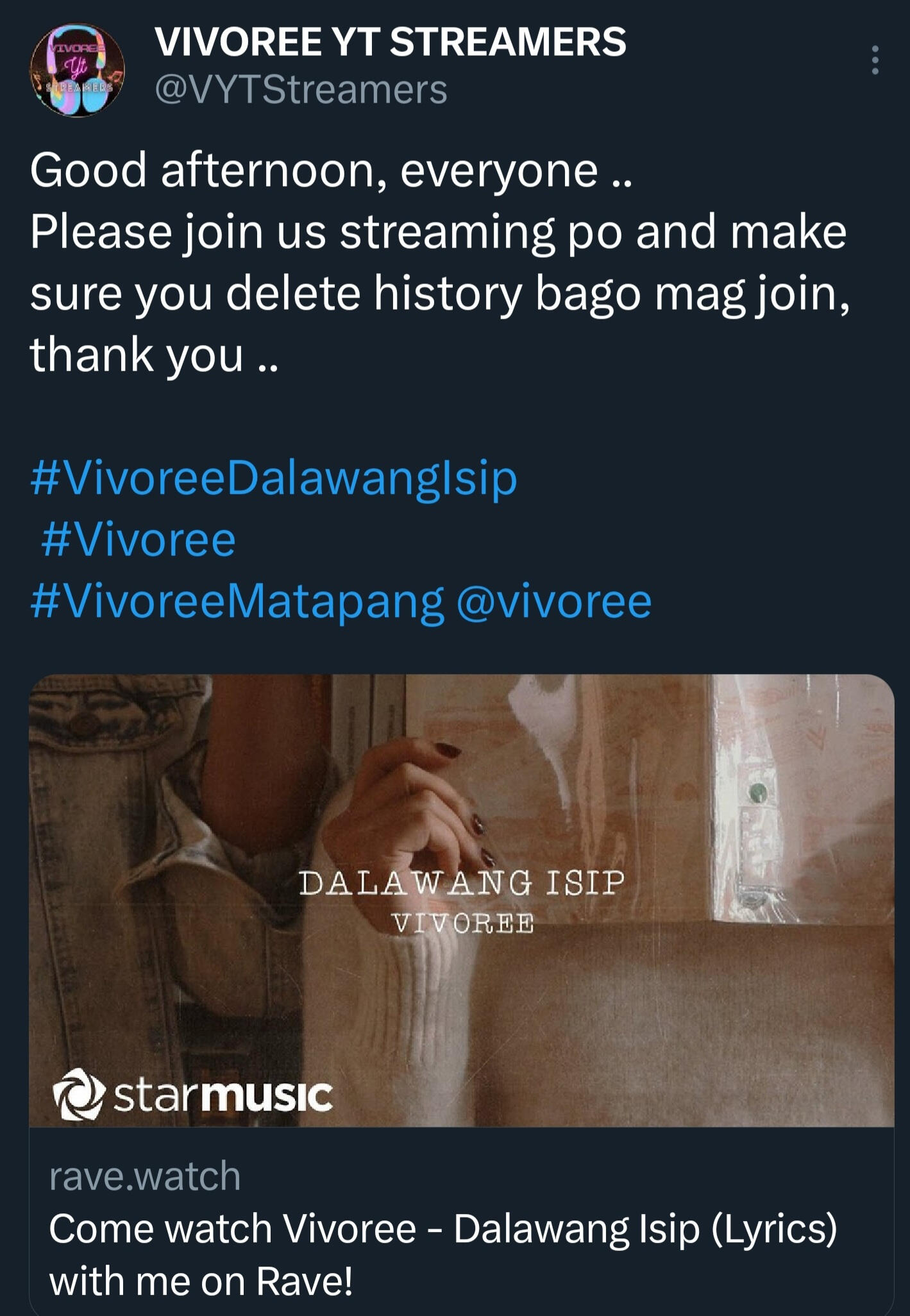 FOLLOW @VYTStreamers ON TWITTER AND CLICK THE RAVE LINK THAT THEY SHARE EVERYDAY.